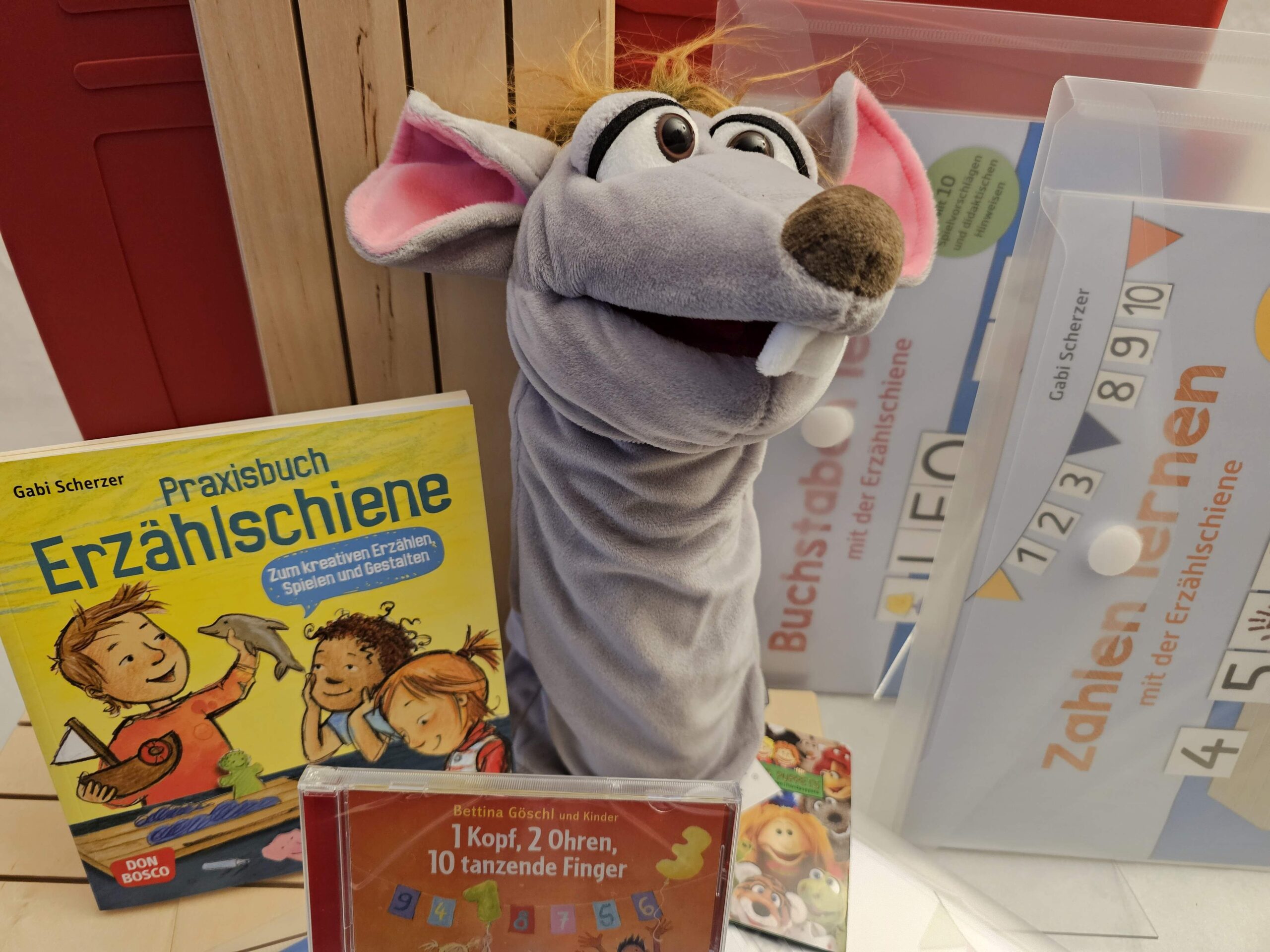 Der Erzähl mal Koffer  animiert Kinder dazu frei zu erzählen. Die Erzählschiene mit verschiedenen Themen und die LivingPuppets helfen dabei.