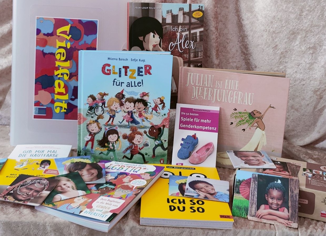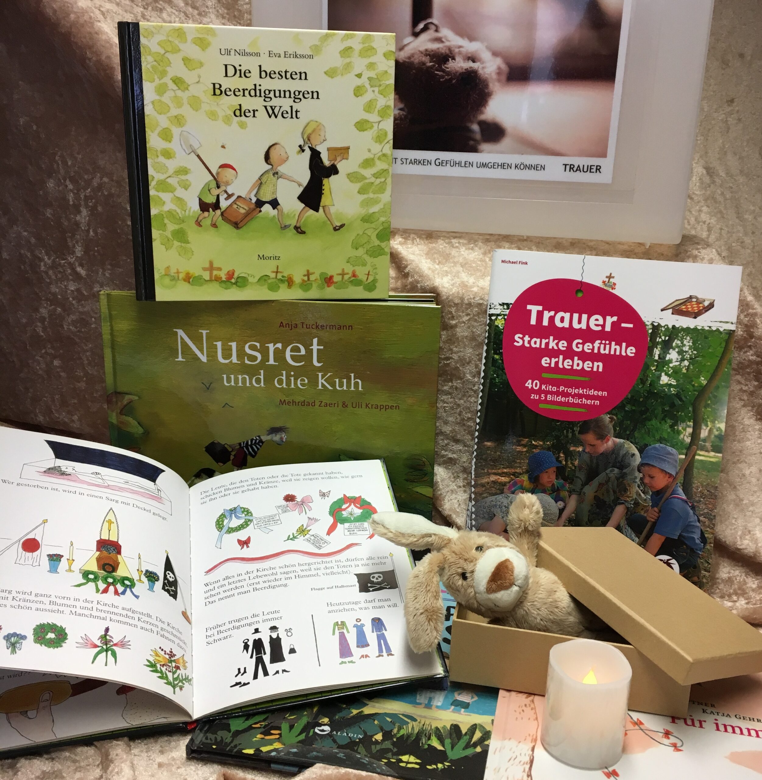 Der Erzählkoffer TRAUER beantwortet die vielfältigen, neugierigen Fragen der Kinder zu Themen wie Tod, Abschied und Erinnerung mithilfe vieler Bilderbuchgeschichten.